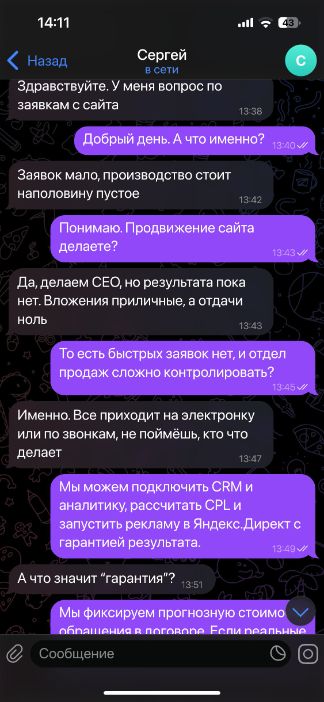 Мы настраиваем и ведём рекламу в Яндекс.Директ, которая приводит целевых клиентов в ваш бизнес. Перед запуском рассчитываем рыночную стоимость обращения (CPL — стоимость лида) и фиксируем диапазон в договоре. Если фактическая стоимость обращения превышает допустимый порог — возвращаем до 100% оплаты за ведение рекламных кампаний.